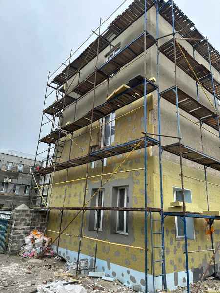 Ein Teil der Fassade ist bereits fertiggestellt.