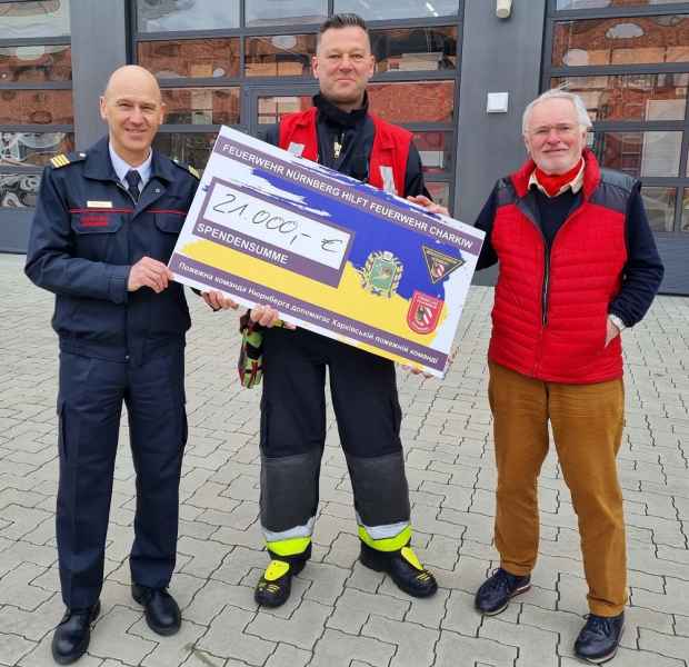 Die Nürnberger Feuerwehr sammelte über 21.000 Euro für die Charkiwer Feuerwehr und überreichte Peter Pohl vom Vorstand des Partnerschaftsvereins inen entsprechenden Scheck. Vom Partnerschaftserein erhielt der Charkiwer Rettungsdienst bereits Hunderte von neuen Feuerwehrschläuchen, über 70 Paar Schutzhandschuhe und 10 Schutzwesten für die Feuerwehrleute .