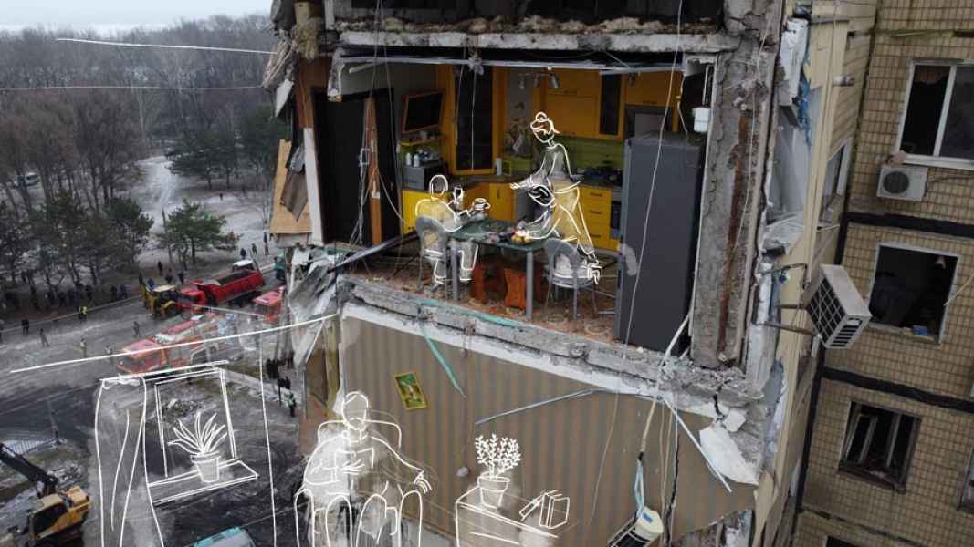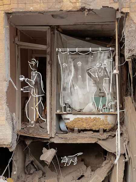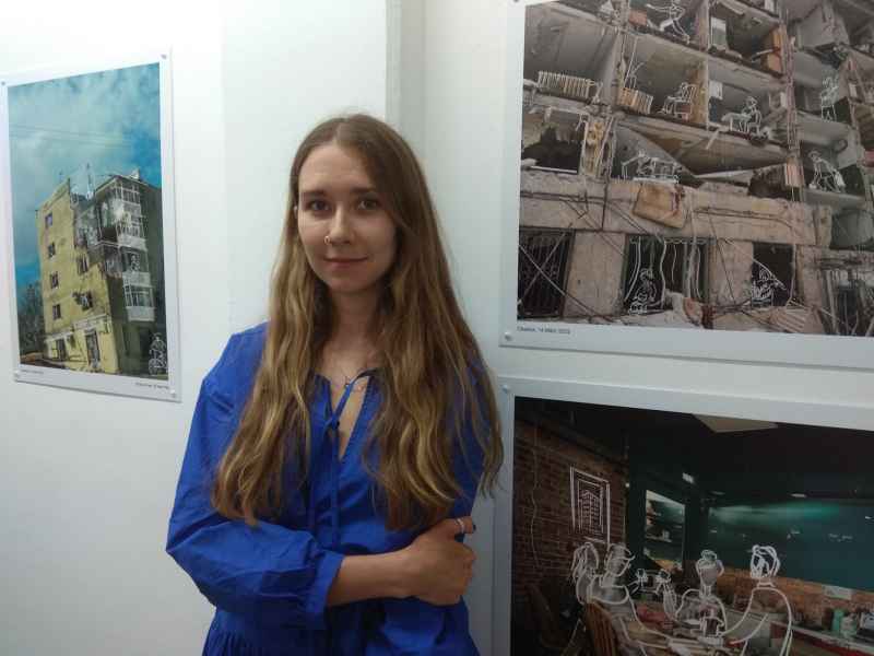 Die Charkiwer Künstlerin Sasha Anisimova versieht Fotografien mit Zeichnungen und kurzen Texten und verbindet somit die beiden künstlerischen Gattungen Fotografie und Grafik. Die literarischen Einlassungen nehmen tagebuchartig auf die Kriegsgeschehnisse vor Ort in Charkiw Bezug und kommentieren sie.