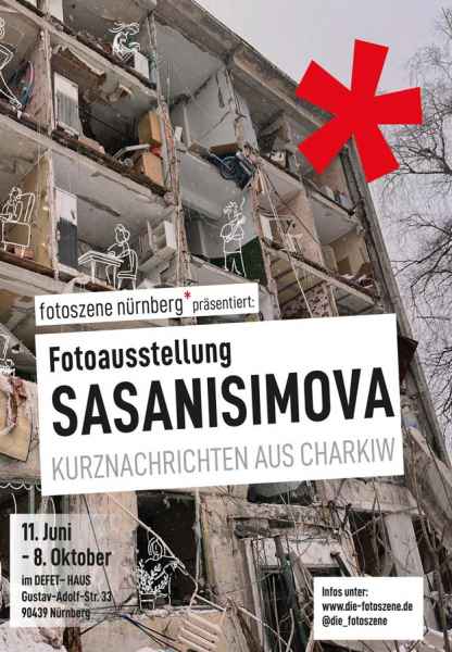 Bis zum 8. Oktober ist die Ausstellung der Charkiwer Künstlerin Sasha Anisimova „Sasanisimova - Kurznachrichten aus Charkiw" im Atelier- und Galeriehaus Defet, Gustav-Adolf-Straße 33, Nürnberg, zu sehen.