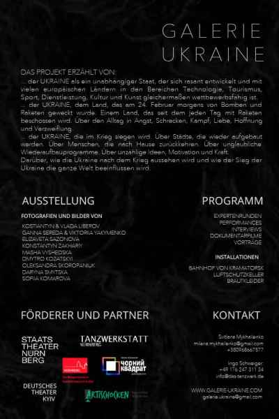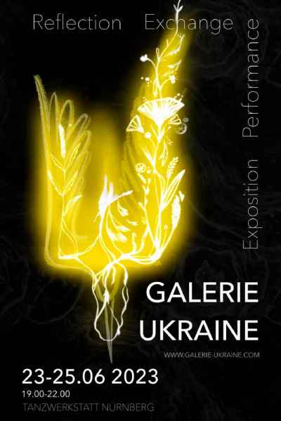 Ein abwechslungsreiches Programm mit Performances, Dokumentarfilmen, Vorträgen und Expertenrunden bietet die Veranstaltungsreihe GALERIE UKRAINE, die vom 23. Juni bis 25. Juni, jeweils von 19 bis 22 Uhr in der Tanzwerkstatt Nürnberg (Obere Kanalstraße 9, 90429 Nürnberg) stattfindet. Sie ist das Ergebnis der Kooperation der Tanzwerkstatt Nürnberg und des Deutsches Theater Kyiv mit dem Staatstheater Nürnberg und dem ArtiSchocken Kollektiv.